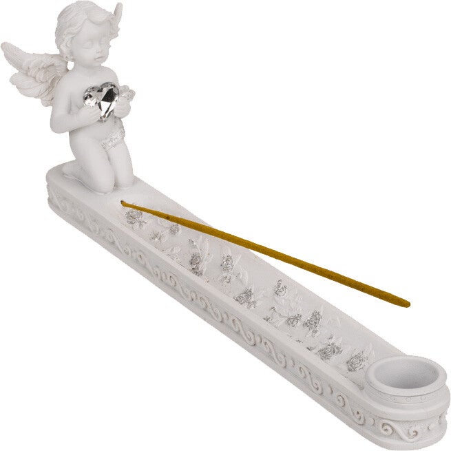 Røkelsesholder med en fin engel som holder et sølv krystallhjerte.