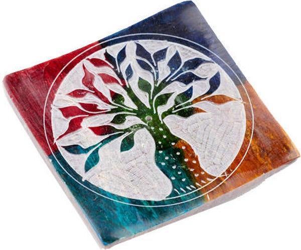 Fin enkel firkantet steinplate i Chakra farger med Livets Tre. For røkelsespinner med fine detaljer.Høyde: 1,5cmLengde: 7,5cmBredde: 7,5cmFarge: MixMateriale: Stein